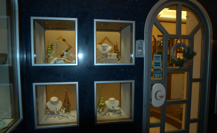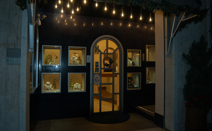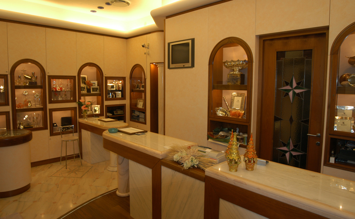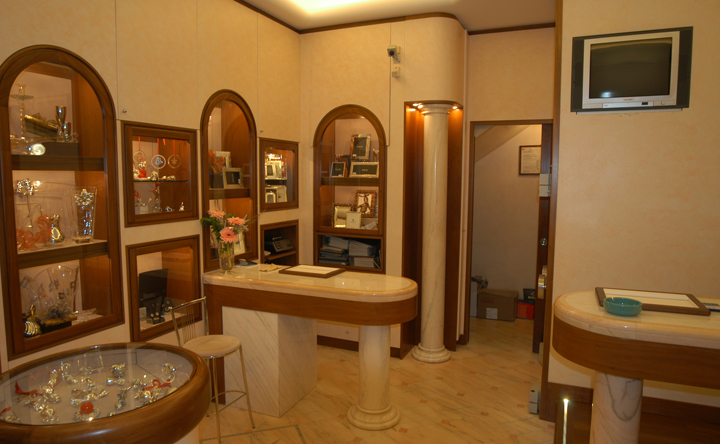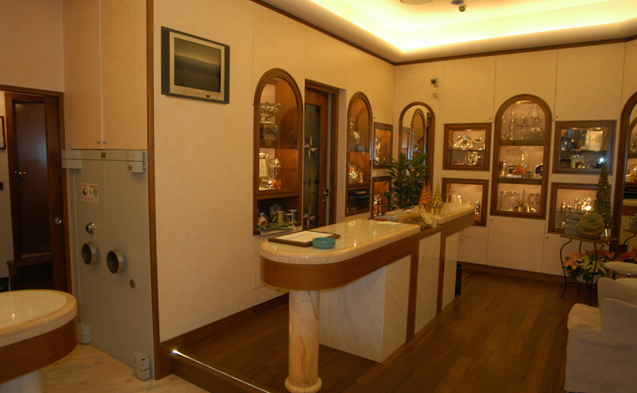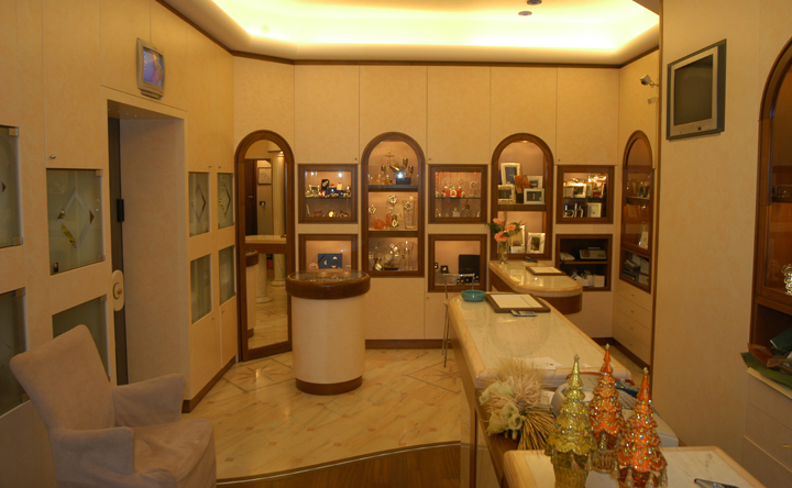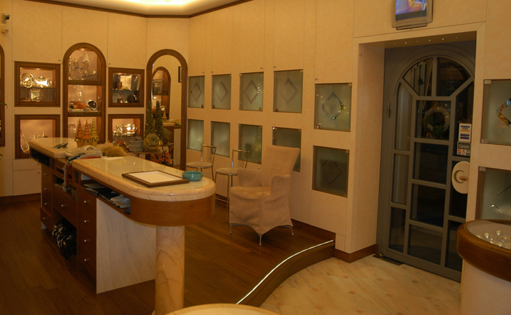 Arredo gioielleria Genova Nervi, con utilizzo di marmi fiorentini, massiccio di noce e spatolati di calce